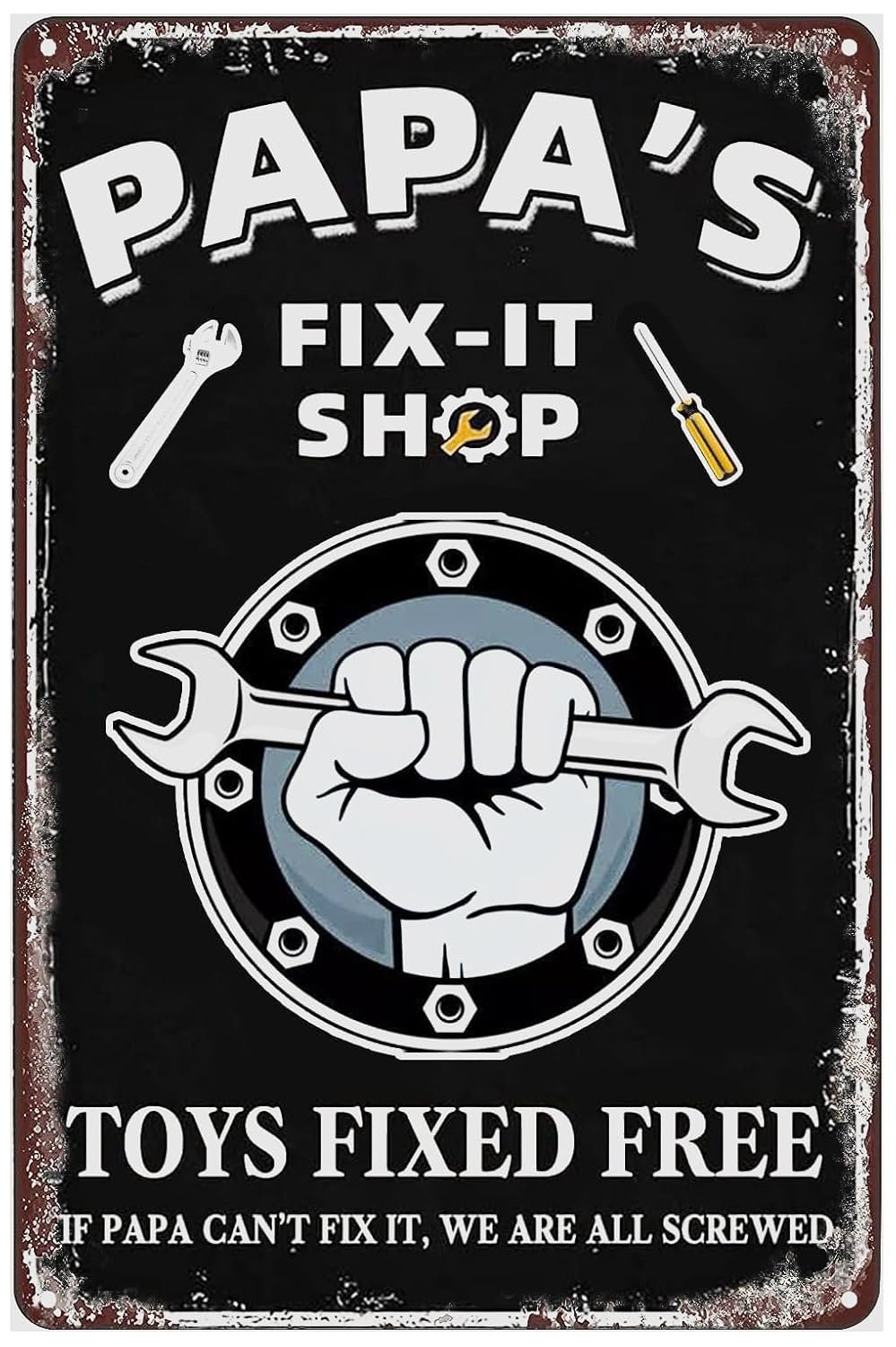 This is a great sign. Nothing complicated here. The metal is medium thick and not cheap with a wrapped border that gives it stability. There are 4 pre-drilled holes for mounting and the sign has a rusty-worn look. I really like it. Full transparency, this sign means a lot to me as a father and grandfather because I am ALWAYS fixing things for everyone. I go by “PA” so I slightly altered this sign for me.